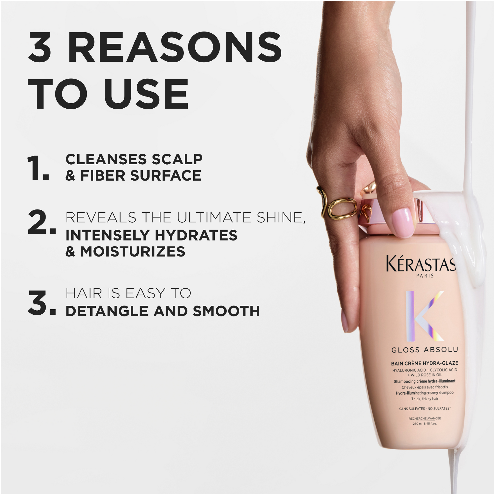 Formulated with hyaluronic acid, glycolic acid and wild rose oil, this creamy shampoo deeply nourishes and hydrates, helping control frizz for up to 4 days* while leaving hair glossy, soft, and bouncy. The rich lather purifies the scalp and smooths the fibre for a polished, radiant finish.